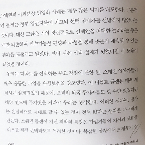 적절한 디폴트 플랜, 즉 경쟁 입찰을 통해 운용자들을 선발하여 주로 지수펀드들로 구성된 디폴트 플랜을 선택한 스웨덴의 선례를 따르는 데서 출발해야 할 것이다. 그런 다음 가입자들이 간소화된 선택 프로세스를 거치도록 안내하는 것이다.