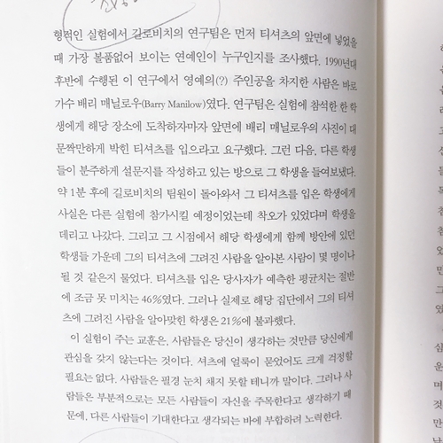 < 와우~난 밖에 나가면 나만 쳐다보는 거 같은데 그게 아니었구나. 그런데 아니 진짜 분명 사람들이 나 의식 했었는데? 분명 느꼈는데 아니었다고? 보통 다 자신을 의식하고 있다는걸 느끼지 않나? 응 그냥 착각이었던거지. >