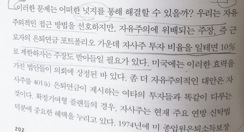 셋째. 고용주의 분담금을 자사주로 받는 근로자들은 그 기여분을 암묵적인 조언으로 받아들인다.