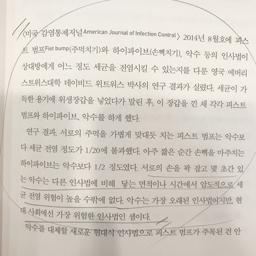 그동안 우리의 인사법은 신체적 접촉을 관대하게 허용하고 있었던 것이다. 친밀함을 드러내고 신뢰를 보여주는 데 접촉만큼 강력한 것도 없기 때문이다.