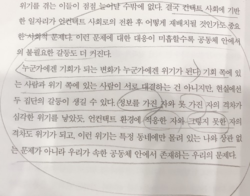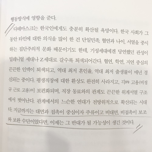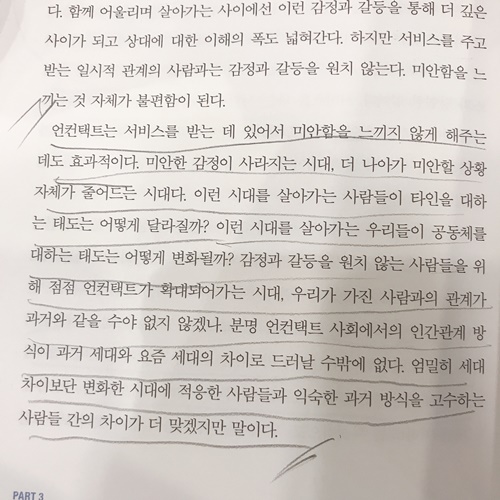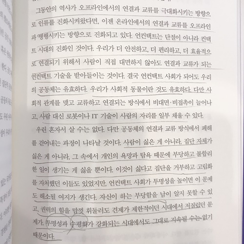 당연하던 모든 것이 당연 해지지 않기 던에, 당연했던 것 중에서 문제 될 것들을 과감히 내려놓는 것을 우린 받아들여야 한다. 컨택트 사회만 고집하다간 위기 상황 앞에서 일상이 멈춰버린다. 언컨택트 사회를 받아들이면서 우린 계속 일상을 이어 가야 한다.